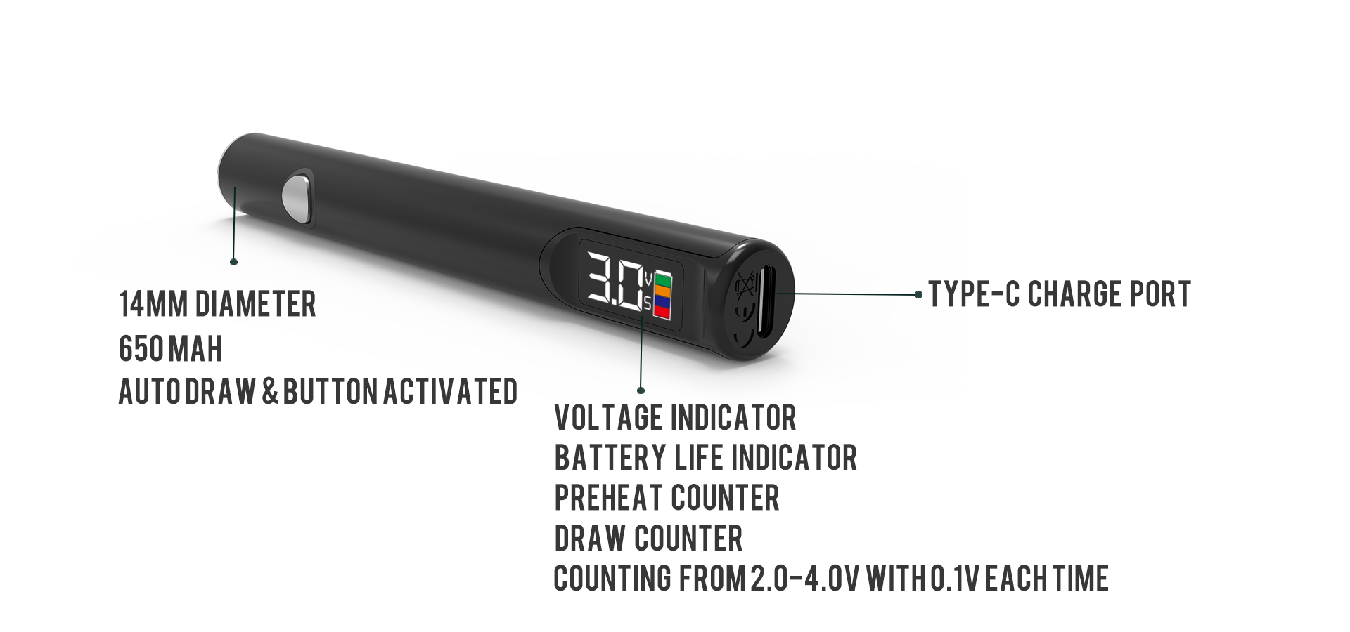 Pluto 510 XLは、デジタルカラースクリーンを搭載した最新設計の510スレッドバッテリーです。650mAhのバッテリーを内蔵し、2.0V〜4.0Vの間で0.1V刻みの微調整が可能。残量やドローカウントを一目で確認できるインターフェースにより、シンプルかつ直感的な操作を実現しました。